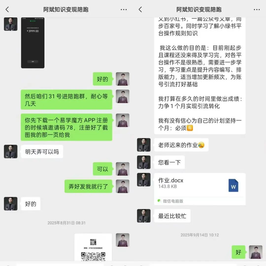 因为有负债压力大,那时候他晚上在烧烤店上班,早上下班了又花两三个小时的时间操作网盘这个项目,人一旦没了退路那挣钱的欲望和执行力就起来了,去年8月份我开第6期知识变现陪跑班的时候,阿斌又再次报名加入。
