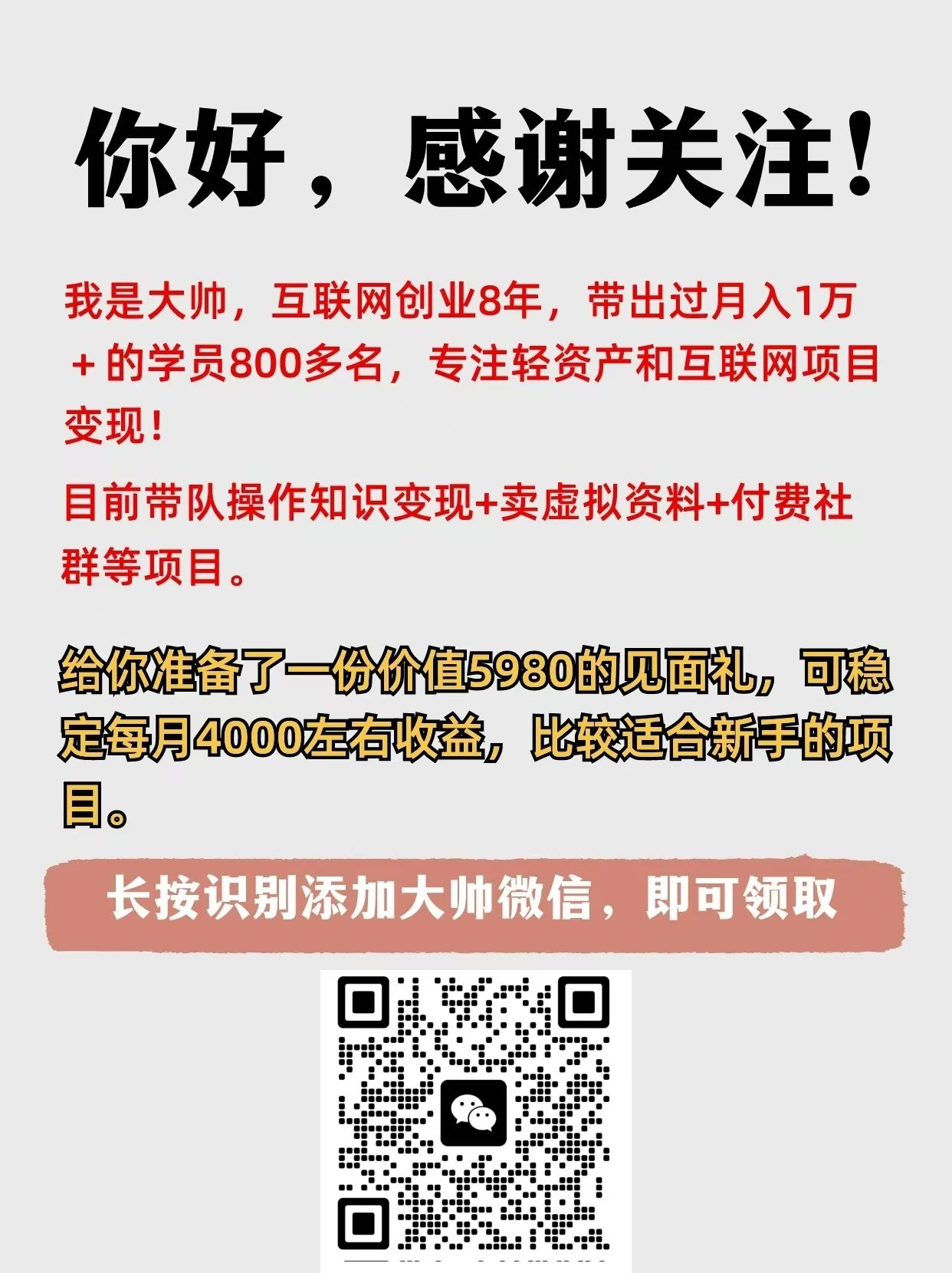 大帅简介:90后轻资产创业者,拥有8年互联网实战经验,熟悉各种项目流量思路,带出过1000多名优秀学员,专注轻资产和互联网项目变现。微信:522856213,公众号【小帅讲干货】,关注后添加我领取3个简单易上手的小项目